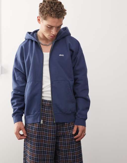 Obey - Hoodie met pigment, logo in kleine letters en rits in marineblauw