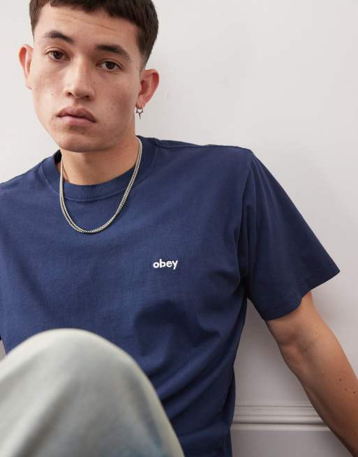 Obey - T-shirt met pigment en logo met kleine letters in marineblauw