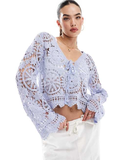 Object - Gehaakte cropped top met klokmouwen in lichtblauw