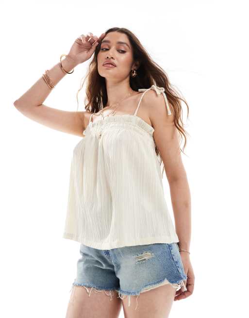 Object - Gesmokte luchtige camitop met strikdetails in crème