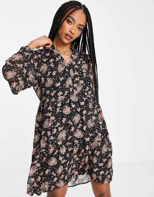 Object - Gitte - Aangerimpelde mini-jurk met bloemenprint in zwart