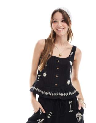 Object - Jersey top met borduursels en knoopsluiting in zwart, deel van co-ord set