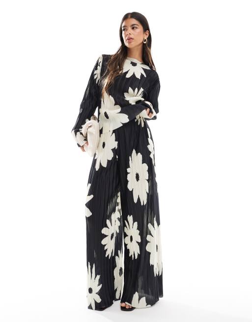 Object - Plissé broek met wijde pijpen in zwarte bloemenprint, deel van co-ord set