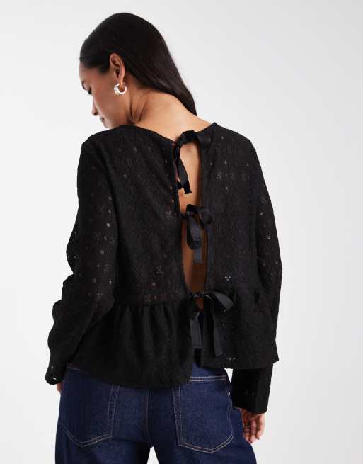 Object - Top van jersey kant met peplum zoom en gestrikte achterkant in zwart