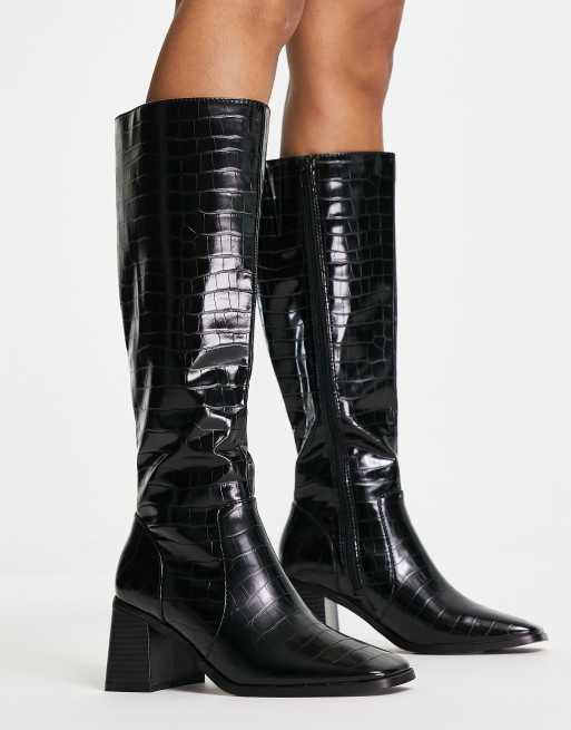 Office - Kabul - Kniehoge laarzen van PU met blokhak en krokodillenmotief in zwart