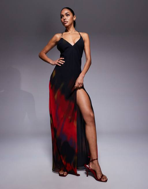 Oh Polly - Maxi jurk van chiffon met dijsplit in rode vervaagde print
