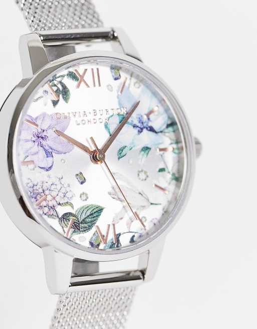 Olivia Burton - Bejewelled - Horloge met bloemen en mesh band in zilverkleur