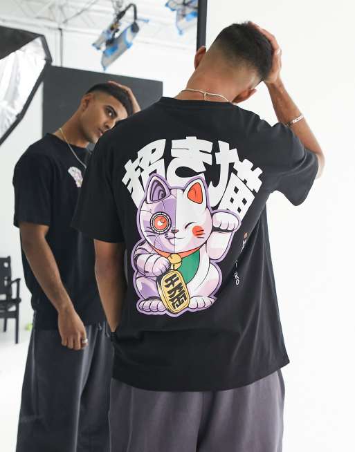 Only & Sons - Oversized T-shirt met print van Japanse gelukskat op de achterkant in zwart