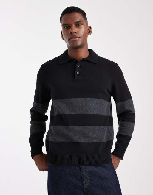 Only & Sons - Ruimvallende gebreide polo met lange mouwen in zwart en grijze strepen