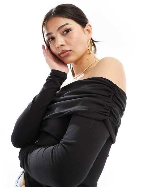Only - Bardottop met gerimpeld detail in zwart