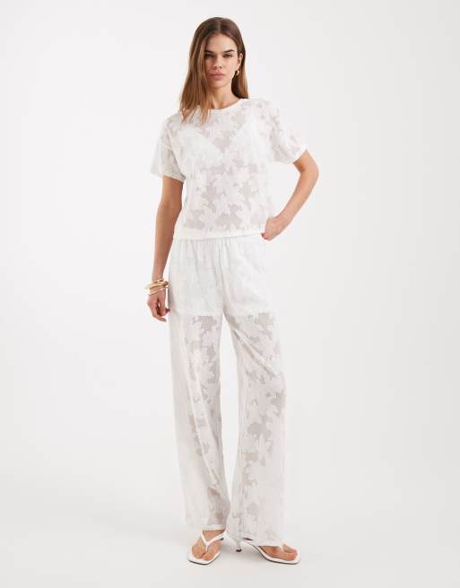 ONLY - Co-ord set van broek met wijde pijpen en recht T-shirt van kant in wit