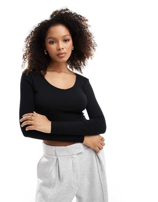 ONLY - Geribbelde top met lange mouwen en V-hals in zwart