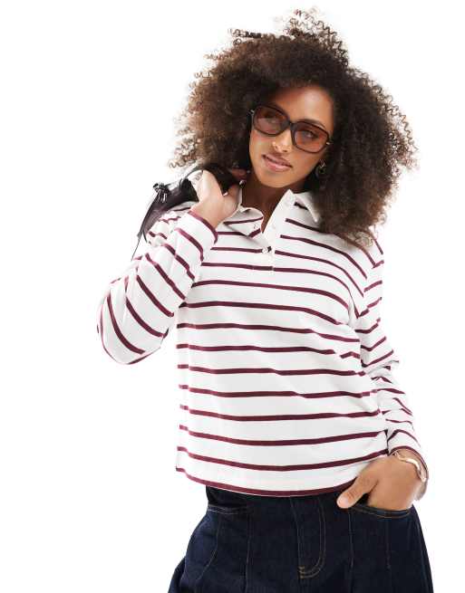 ONLY - Gestreepte polo met lange mouwen in wit en bordeauxrood