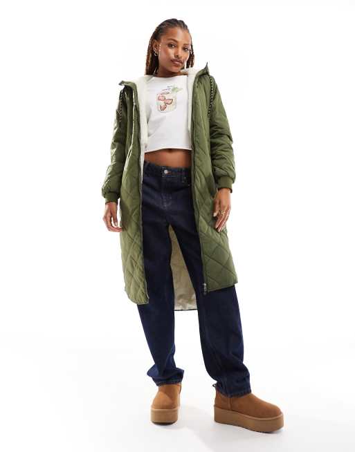 Only - Gewatteerde jas met lange pasvorm en capuchon van teddystof in kaki