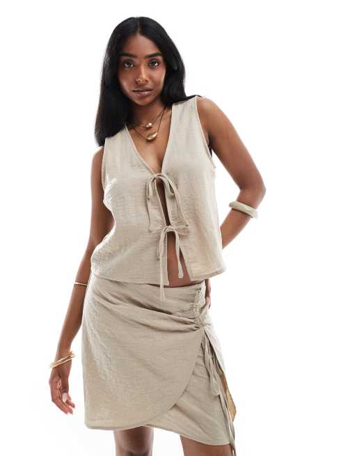 ONLY - Hemdje met gestrikte voorkant in beige, deel van co-ord set