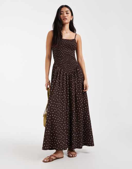ONLY - Mouwloze maxi jurk met smokwerk in bruin met stippen