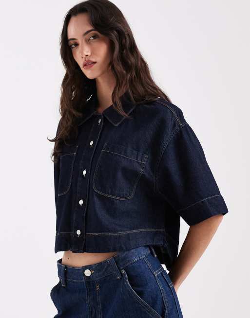ONLY - Recht cropped denim overhemd in donkerblauw met spoeling