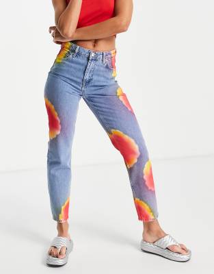 Only - Rechte jeans met hoge taille in lichtblauw met tie-dye vlekken