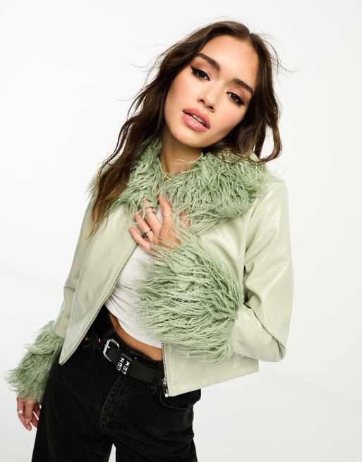 Only - Vinyl jack met ruig imitatiebont in saliegroen