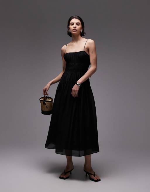 & Other Stories - Aangerimpelde melkmeisjes midi-jurk met dunne bandjes in zwart