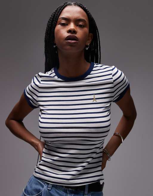 & Other Stories - Aansluitend jersey T-shirt met kapmouwtjes, blauwe strepen en borduursel