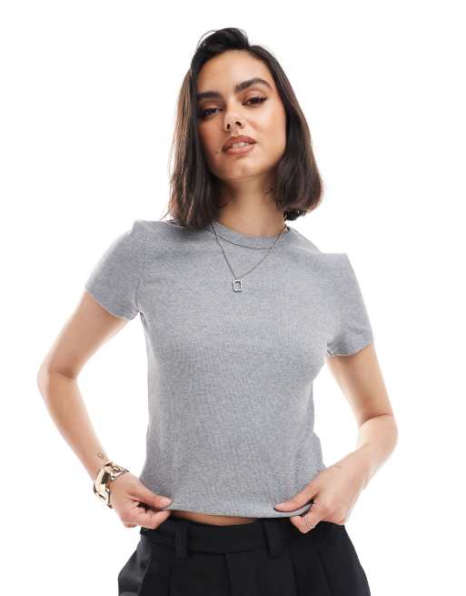 & Other Stories - Geribbelde aansluitende top met korte mouwen in gemêleerd grijs