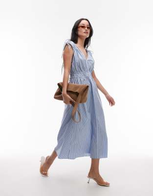 & Other Stories - Gestreepte midaxi jurk met rimpeleffect en gestrikte schouderbandjes in blauw