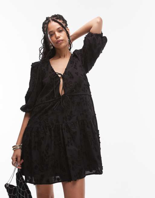 & Other Stories - Mini jurk met striksluiting, borduursel en gelaagde zoom in zwart