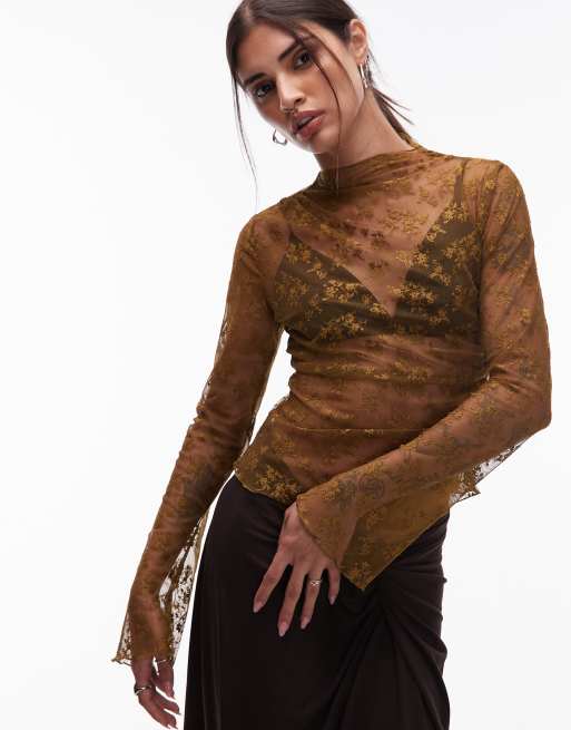 & Other Stories - Top van kant met stretch, lange mouwen en gerimpelde zijkant in bruin
