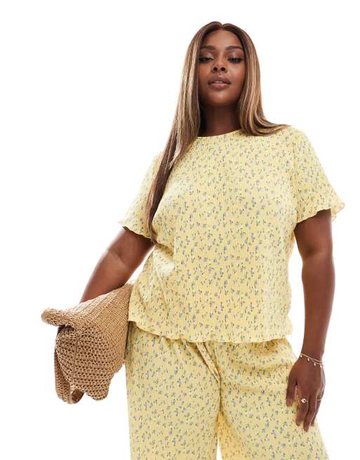 Pieces Curve - Baby T-shirt van plissé met fijne bloemenprint in geel, deel van co-ord set