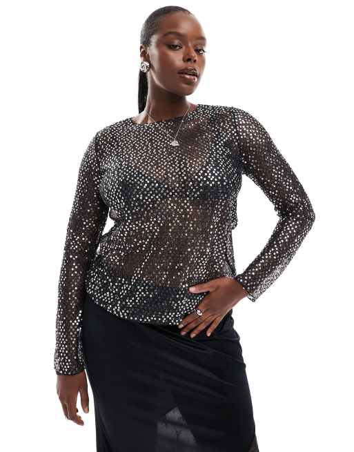 Pieces Curve - Top van mesh met lange mouwen en lovertjes in zwart