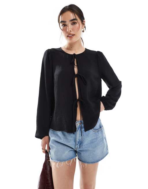 Pieces - Blouse met gestrikte voorkant in zwart
