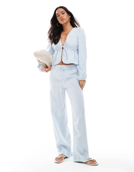 Pieces - Broek van gekreukt katoen met wijde pijpen in lichtblauw, deel van co-ord set