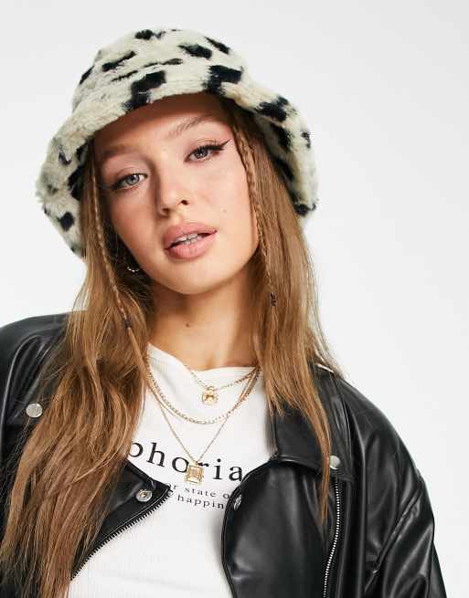 Pieces - Bucket hat van teddystof met hartenprint in zwart en wit