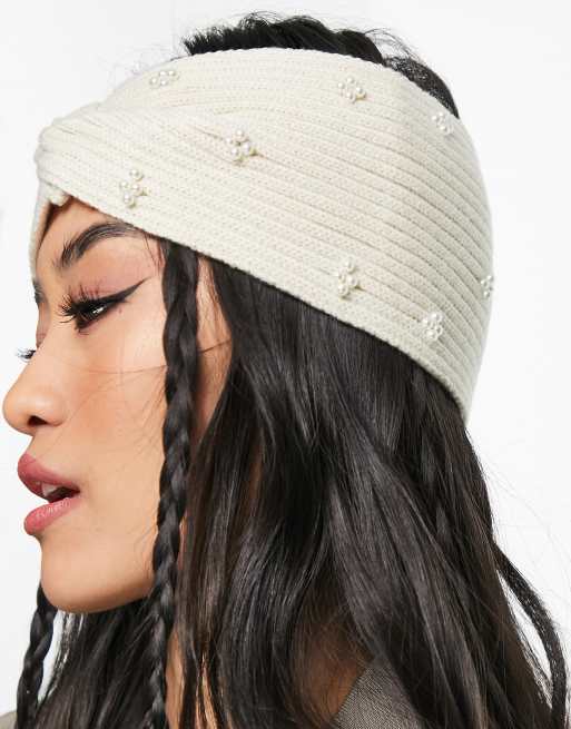 Pieces - Gebreide hoofdband met pareldetail in crème