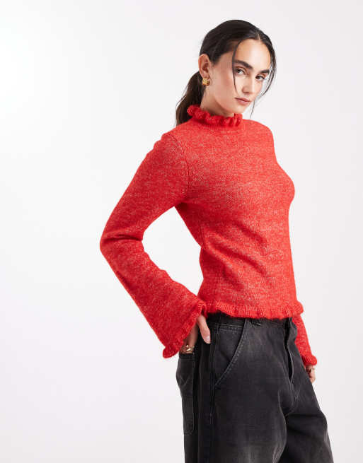 Pieces - Gebreide trui met ruches aan de hals in gemêleerd rood
