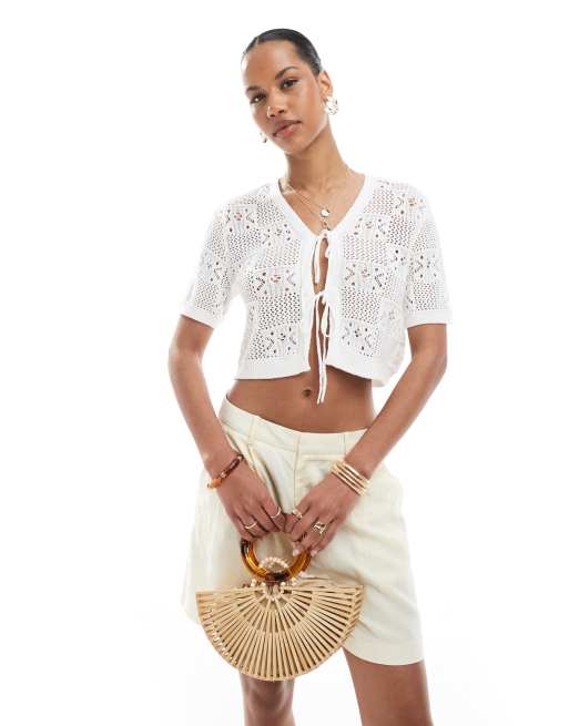 Pieces - Gehaakte top met strikdetail aan de voorkant, bloemen en blokken in crème