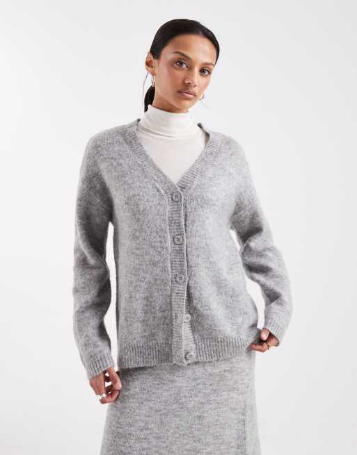 Pieces - Pluizig gebreid ruimvallend vest met V-hals in gemêleerd middengrijs, deel van co-ord set