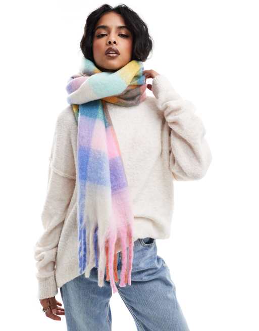 Pieces - Superzachte geruite sjaal met kwastjes in verschillende regenboog pastelkleuren