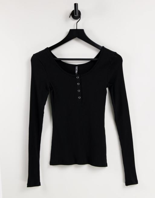 Pieces - T-shirt van katoen met lange mouwen en knopen aan de voorkant in zwart - BLACK