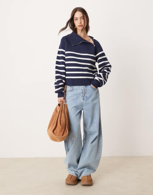 Pimkie - Asymmetrische oversized trui met strepen en kraag met rits in wit en marineblauw