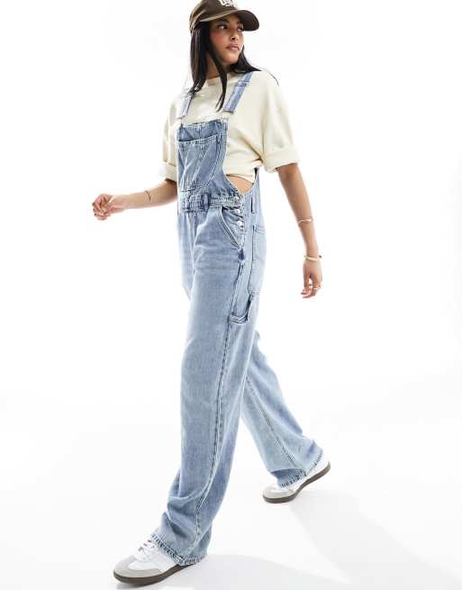 Pimkie - Denim tuinbroek met wijde pijpen in blauw met wassing