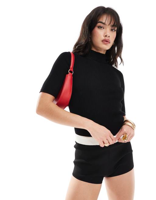 Pimkie - Geribbeld hoogsluitend T-shirt met korte mouwen in zwart