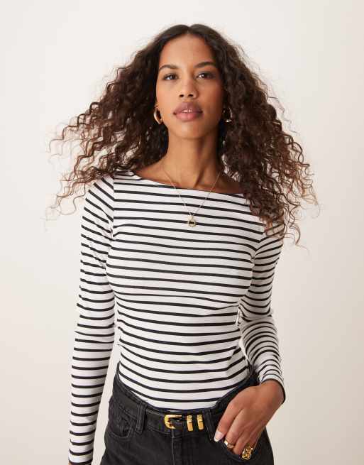 Pimkie - Top met boothals en lange mouwen in wit en marineblauw