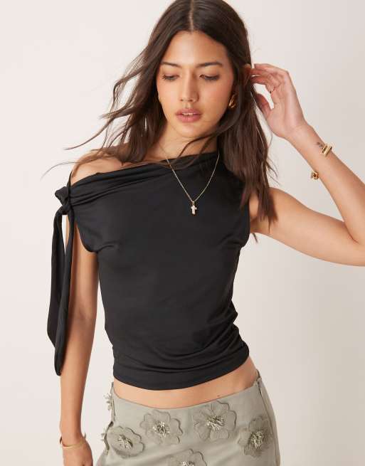 Pimkie - Top van gladde stof met blote schouder met strik en gedrapeerd detail in zwart