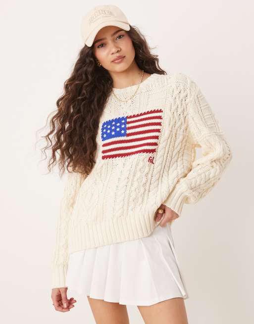 Polo Ralph Lauren - Gebreide kabeltrui met vlag in crème