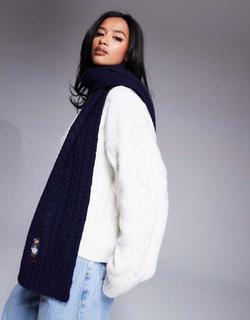 Polo Ralph Lauren - Gebreide sjaal met kabels en berenlogo in marineblauw