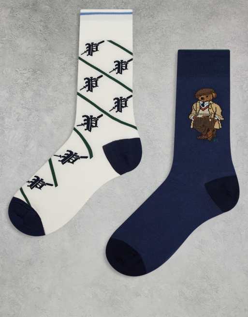 Polo Ralph Lauren - Set van 2 sokken met Bear-print in marineblauw en crème