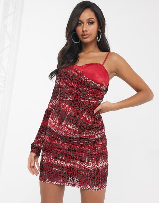 Pretty Darling - Jurk met een blote schouder, bralette detail en rode luipaardprint