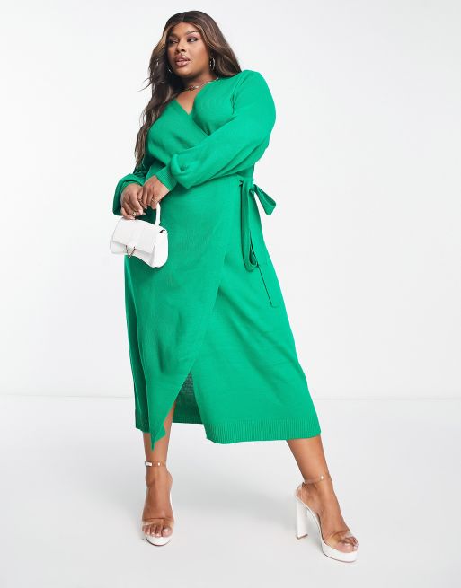 Pretty Lavish Curve - Beau - Gebreide jurk met overslag en gestrikte taille in smaragdgroen